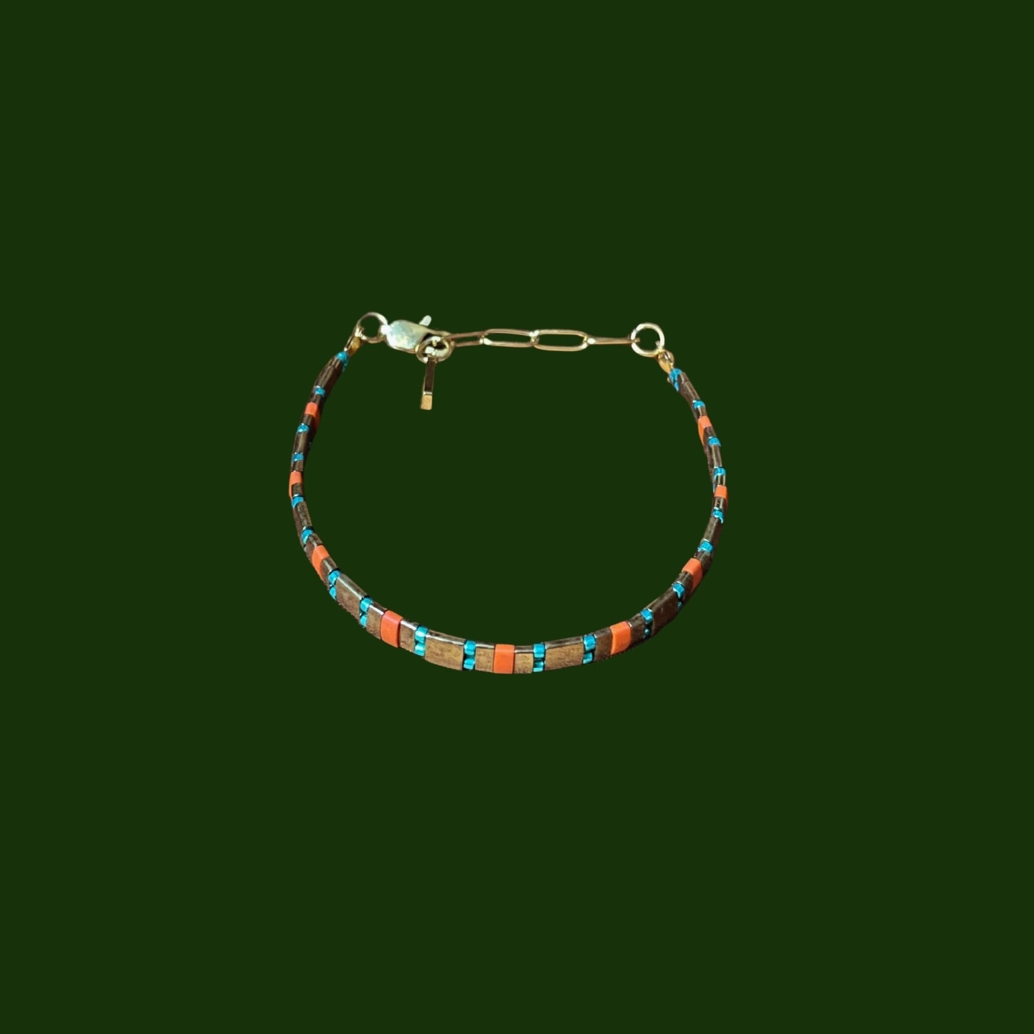 Çöl tonlarından ve antik zarafetten ilham alan iddialı bir tasarım. Sıcak kiremit ve derin turkuaz tonlarındaki Miyuki boncuklarla tasarlanan bu bileklik, doğal şıklığı hafif bir ışıltıyla birleştiriyor 🖤