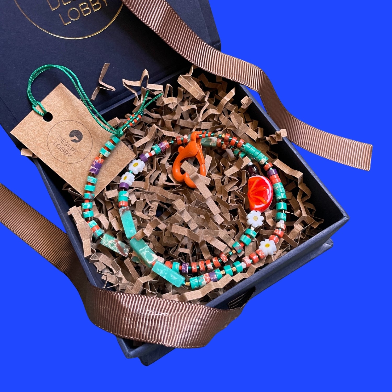 Desert Lobby ürünlerinde kullanılan boncuklar genellikle doğal taş ve camdır. Bu malzemeler tek tek elde üretilir ve elle şekillendirilir. Bu sebeple her bir ürün kendine has ve biriciktir 🧿 Görselde görünen ürün ile size ulaşacak ürün arasında boncuk şekilleri ve renk tonları anlamında ufak farklılıklar olması normaldir.