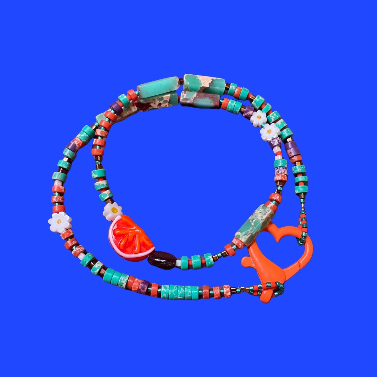 Bu kolye, adını ve güzelliğini mandalinalarıyla ünlü, ışıltılı bir Türk Rivierası kasabasından, Bodrum'dan alıyor 💖 Narenciye kokulu bir esinti, beyaz badanalı köşeler ve güneşin öptüğü bir deniz... Ege’nin ruhu 🍊 Elde şekillendirilmiş Murano cam mandalina, ilkbaharda mandalina ağaçlarının çiçek açışını andıran yeşil tonlu varisit ve zarif beyaz çiçek boncuklarının arasında sizin için parlıyor.