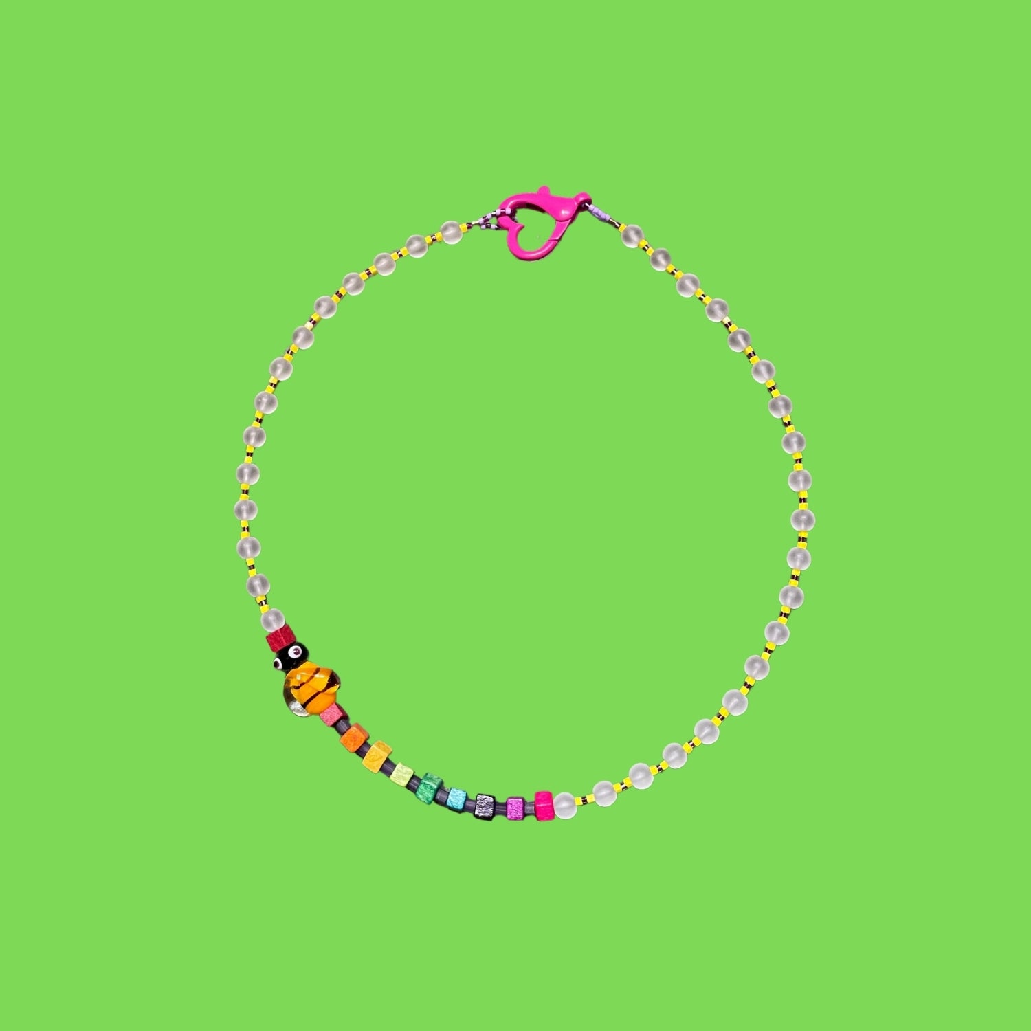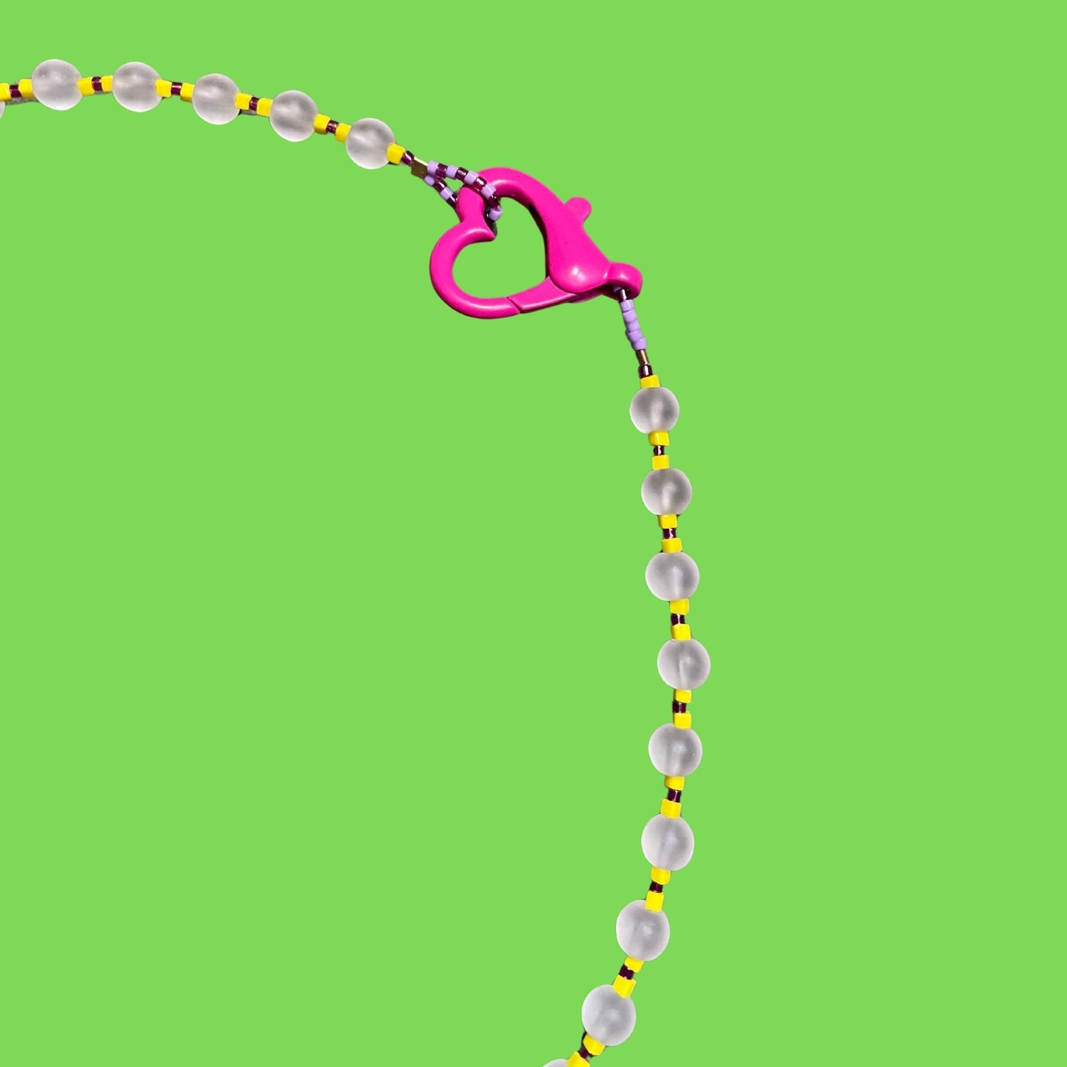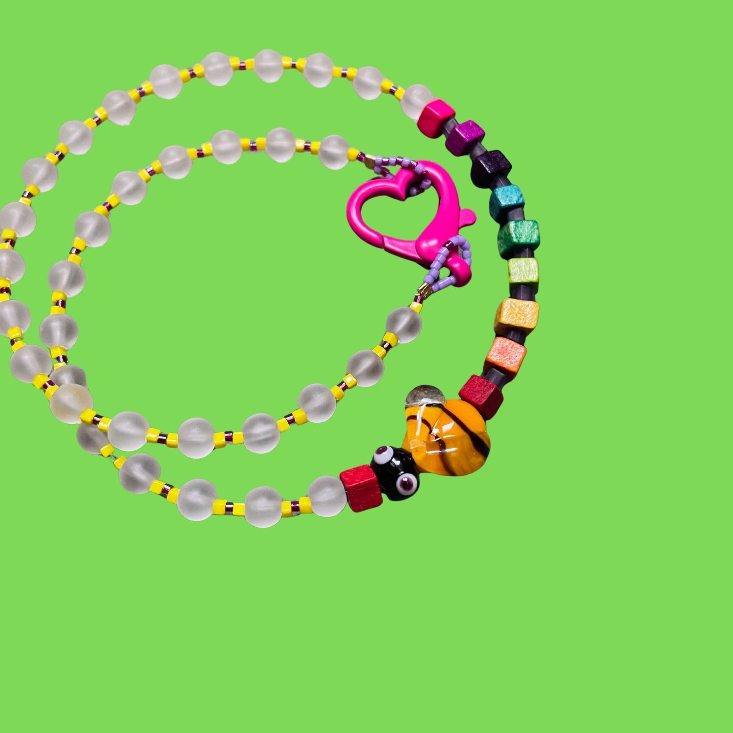 Buzlu termal kuvars boncukları gökkuşağı tonlarında renkli ahşap küp boncuklarla süsledik, küçük detaylar için orijinal Miyuki boncuklar kullandık. Bu tatlı kolyenin odak noktası da tabii ki sevimli arı figürü ve ona eşlik eden fuşya pembe kalp klips 💖