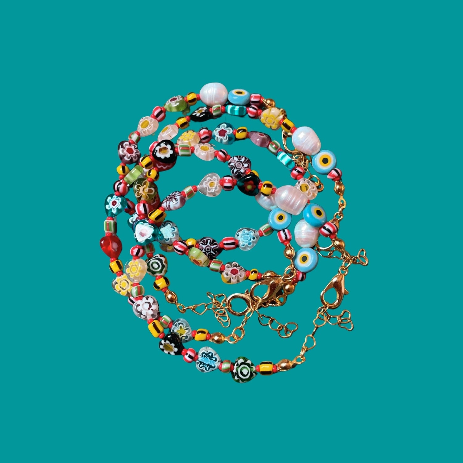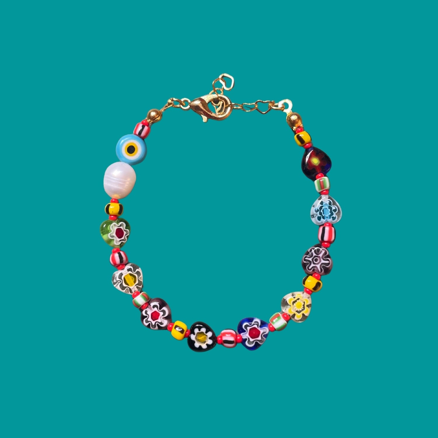Renklerin neşeli bir kutlaması olan bu bileklik; kalp şeklinde millefiori cam boncuklar, kem gözlerden koruyucu nazar boncuğu, inci ve zarif altın renk kalp zincir detaylarını bir araya getiriyor. Millefiori boncuklar çok çeşitli olduğundan, bileklikler genel desene sadık kalınarak karışık renkli dizilmiştir. Bu sebeple görselde görünen boncuklarla size ulaşacak bileklikteki boncuklar farklılık gösterir. Her bir bileklikte renk ve diziliş sırası bakımından farklı bir akış vardır. Listelenen ürün fiyatı tek bir bileklik içindir ❣️