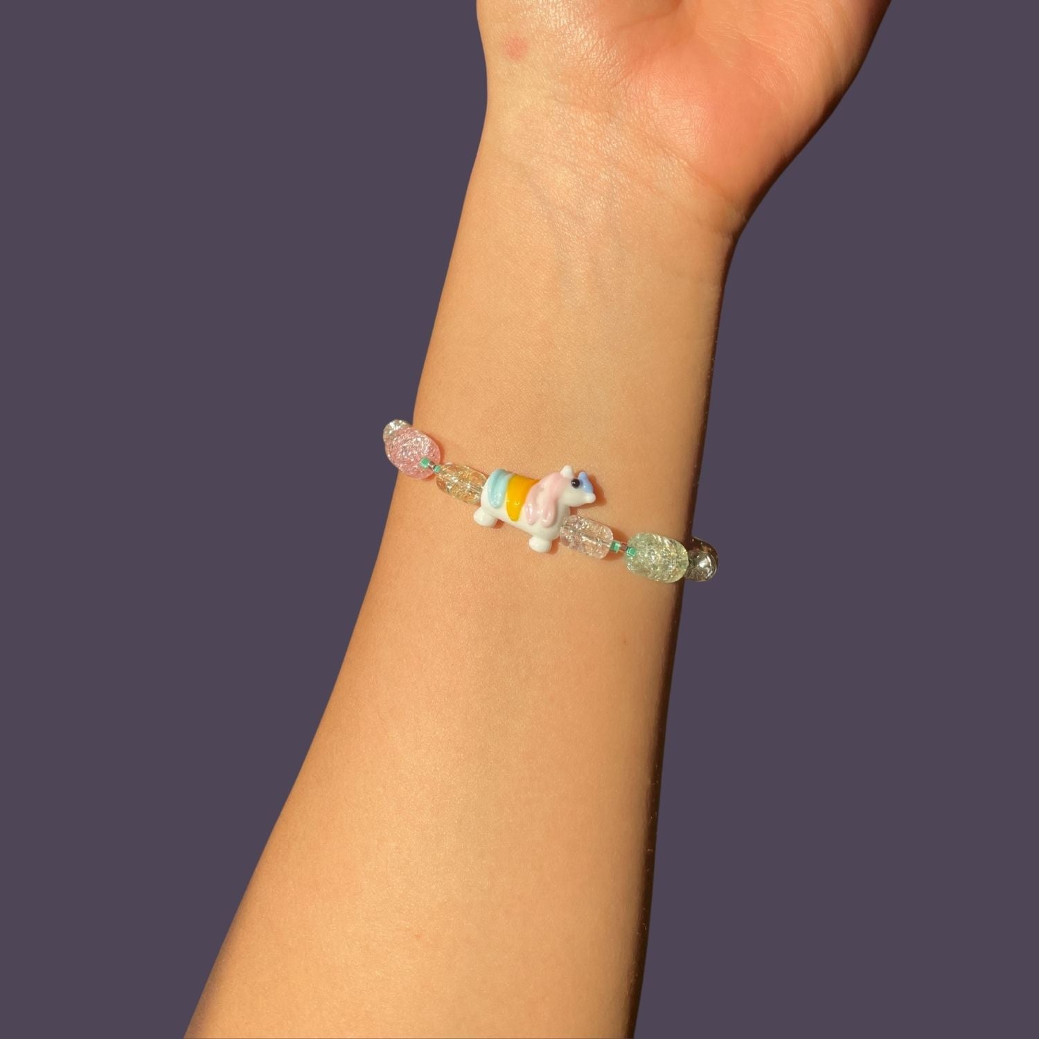 El yapımı cam unicorn figürü, şeffaf, pembe ve pastel tonlardaki boncuklarla tamamlanmış neşeli bir bileklik. Tarzınıza sihirli ve eğlenceli bir dokunuş katmak için ideal 💕