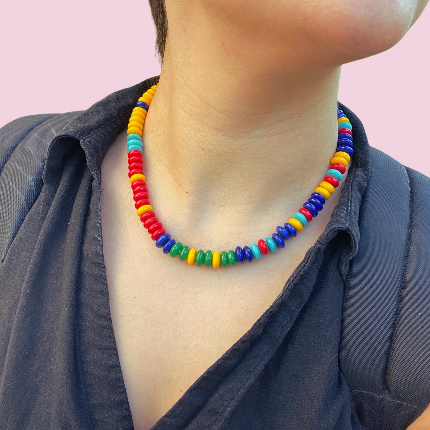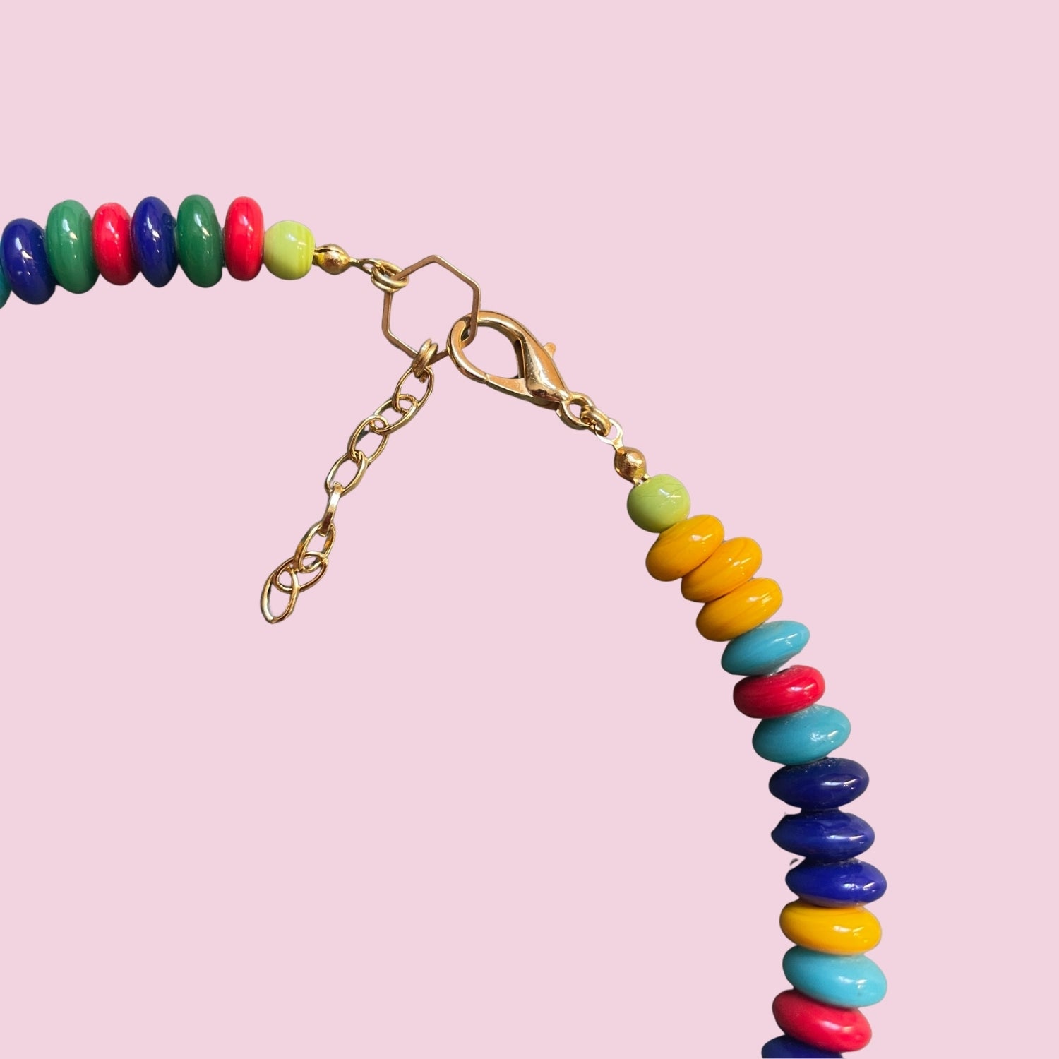 Tamamı el yapımı cam boncuklardan oluşan, ağır yapılı bir kolyedir 🌈